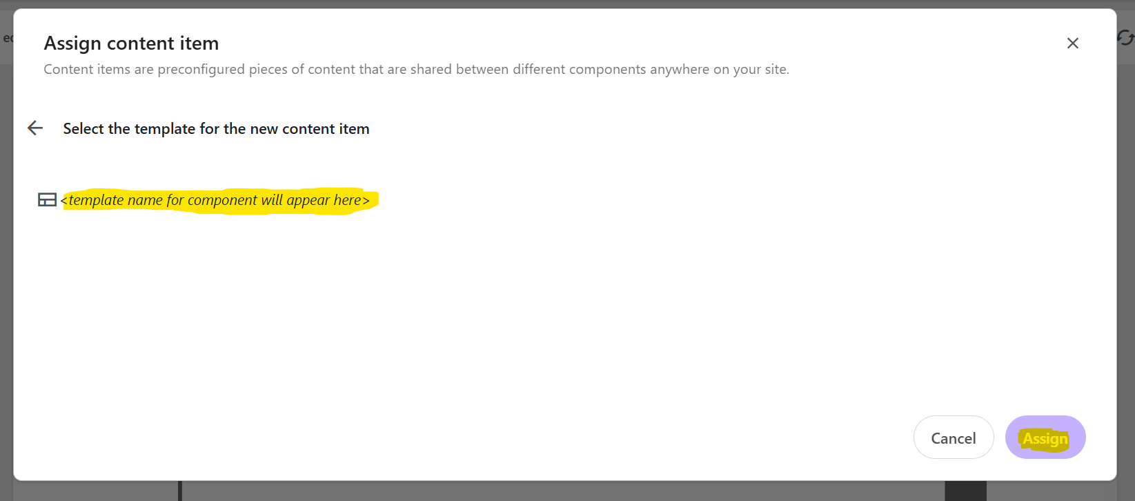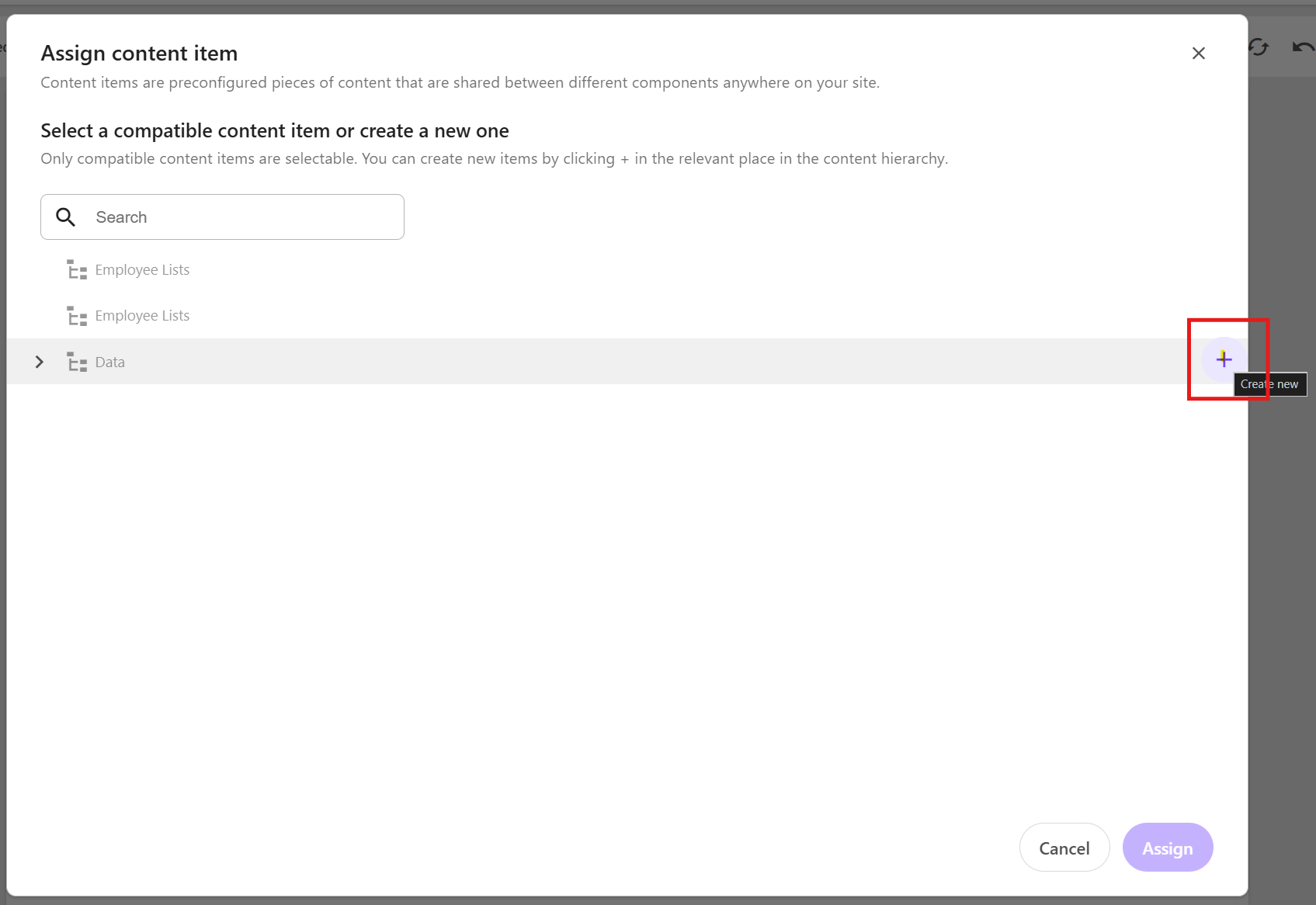 Enter a name for the datasource for the new content item WITHOUT clicking on the datasource itself. Press ENTER once you have finished typing the datasource name and then click Assign.