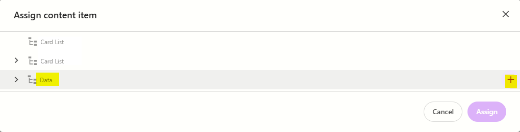 In the Assign content item window, hover over the data folder in the tree and then click on the + icon