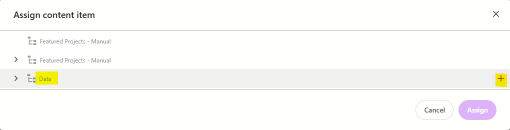In the Assign content item window, hover over the data folder in the tree and then click on the + icon